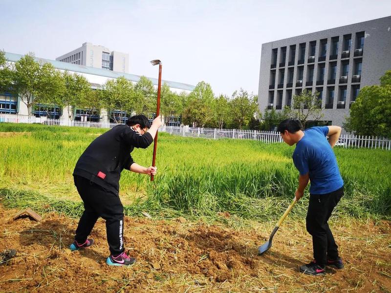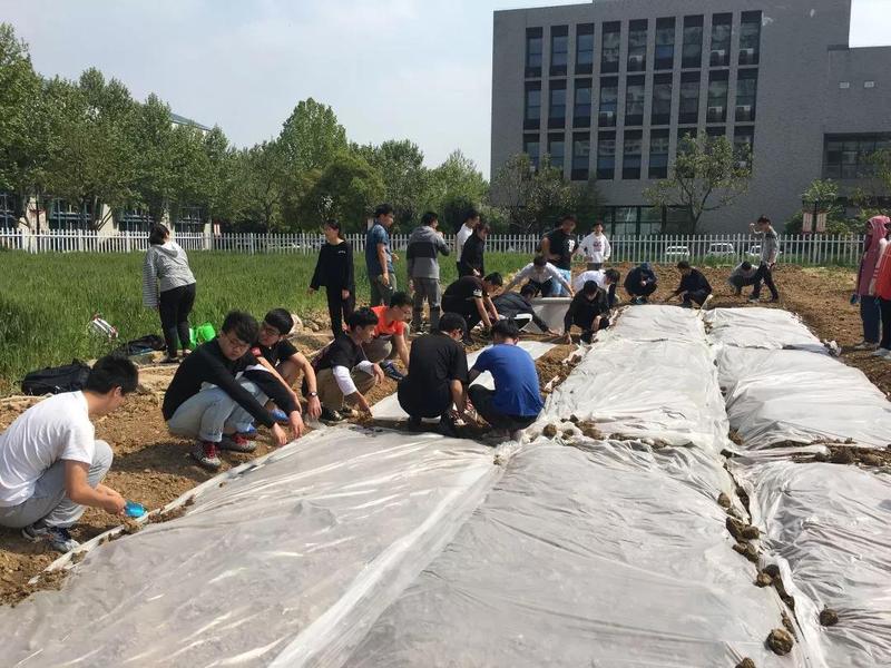 第一步是整地。在种植之前,同学们先将土壤翻过,使其松软,这个过程分为粗 、细耕和盖平三个阶段。随后根据不同作物的需要,开挖田垄,以便后期灌溉时水分可以相对均匀、缓慢地渗透到土壤里。
