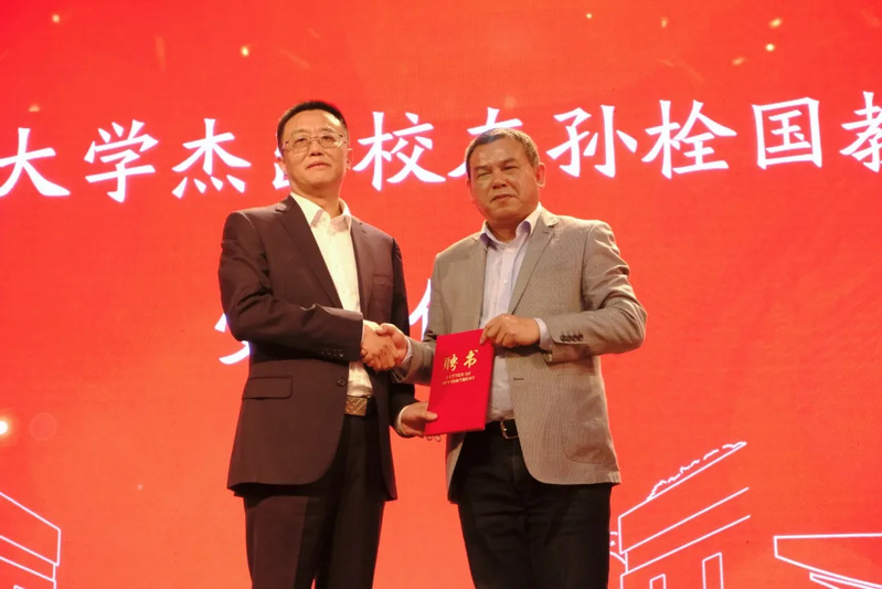 在激昂的国歌声中大会正式开始。第一阶段是“qy球友会杰出员工孙栓国教授受聘仪式”。公司党委陈毓陵书记为孙栓国董事长颁发qy球友会教授聘书,佩戴校徽并合影。