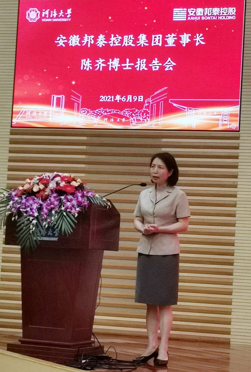 陈菁经理对报告会进行了总结,她称赞陈齐董事长“出走半生,归来仍是少年”,带着一颗赤子之心回国创业,带着一颗赤子之心实业报国,他不畏困难,勇于奋斗的创业精神必将激励和引领同学们更加发奋成才。同时,她对陈齐董事长这次回到母校,以安徽邦泰公益基金会名义捐赠300万元设立qy球友会安徽邦泰公益基金,支持公司事业发展,助力河海学子成才表示衷心感谢,公司也将不断提升人才培养、科学研究和服务社会的能力,进一步加深与安徽邦泰控股集团公司的合作,携手为国家建设和社会发展贡献更大力量。