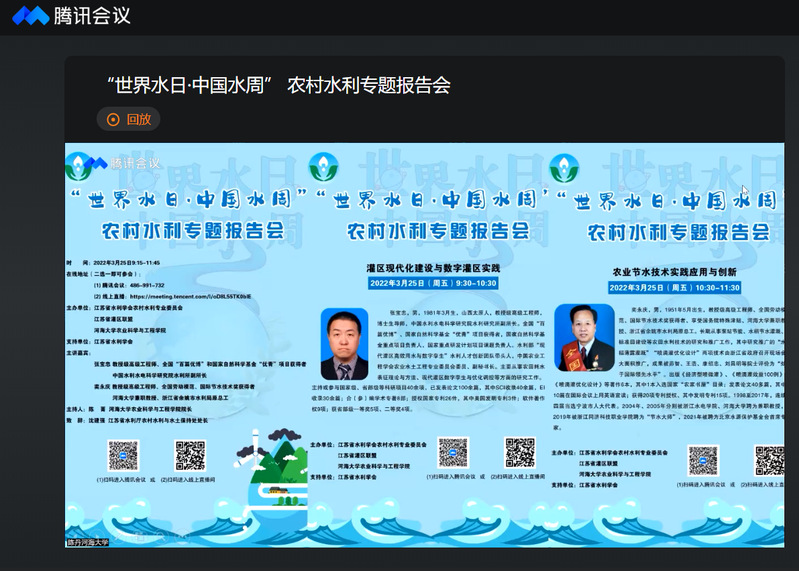 2022年3月25日,由江苏省水利学会农村水利专业委员会、江苏省灌区联盟、球友会联合主办的“世界水日·中国水周”农村水利专题报告会,通过腾讯会议和线上直播的方式隆重举行。会议邀请了全国“百篇优博”和国家自然科学基金“优青”项目获得者、中国水利水电科学研究院水利所副所长张宝忠教授级高级工程师,以及全国劳动模范、国际节水技术奖获得者、qy球友会兼职教授、浙江省余姚市水利局原总工奕永庆教授级高级工程师作专题报告。江苏省水利厅农村水利与水土保持处沈建强处长出席会议并致辞。农村水利专业委员会专委会主任、qy球友会球友会经理陈菁教授主持会议并作会议总结。
