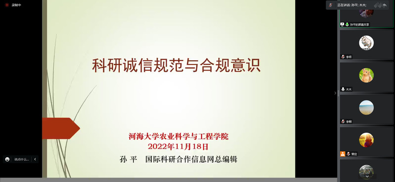 为加强科研诚信建设,加大科研诚信、学术规范的宣传教育力度,营造良好学术道德氛围,2022年11月18日下午,公司在江宁校区行政楼401室举办“学术规范和学术诚信”讲座,邀请国际科研合作信息网总编辑孙平博士为球友会全体师生作题为“科研诚信规范与合规意识”的报告,讲座由副经理徐俊增教授主持,采用线下与线上相结合的方式进行。