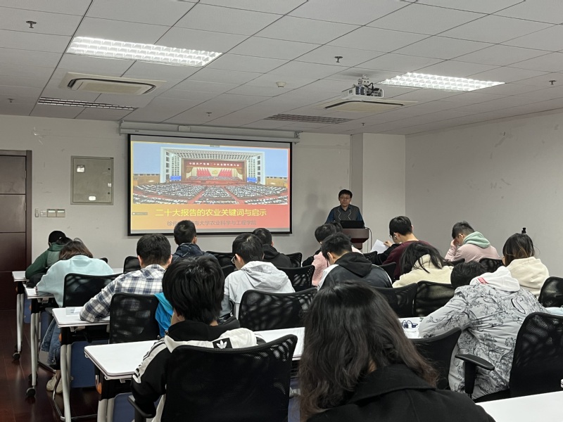2022年11月5日,公司副经理徐俊增为本科生党支部和两办党支部师生党员讲授“二十大报告的农业关键词与启示”专题党课。
